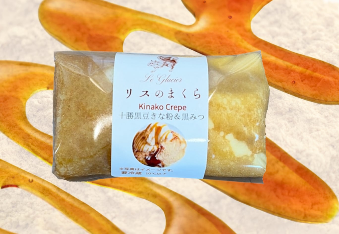 十勝黒豆きな粉のフィリングと黒蜜、自家製カスタードと生クリームが入ったミニクレープです。半解凍の状態でアイスクレープとしても召し上がることができます。